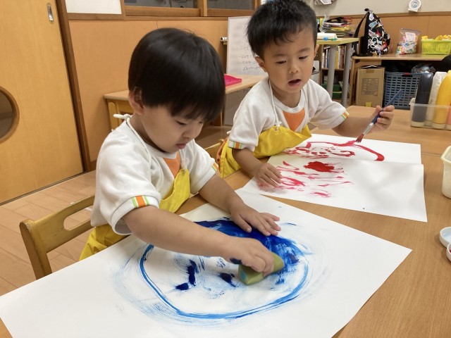 年少クラスは絵の具を使い自分で描きたいものをイメージして描きました!