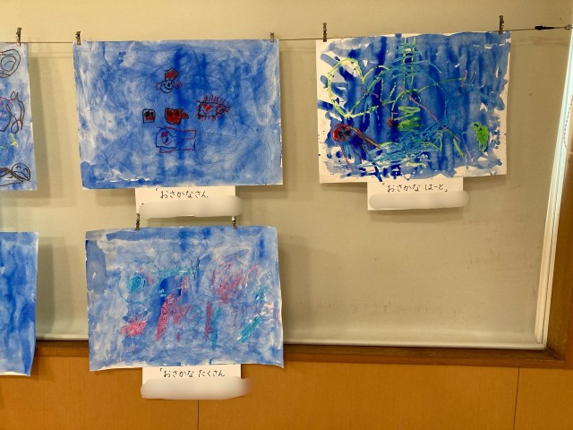 年中クラスはクレヨンや絵の具を使って「海の中」をイメージしながら描きました。