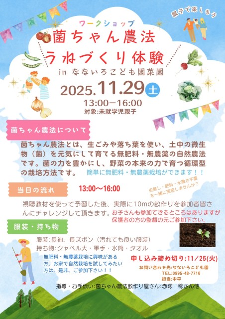 菌ちゃん畝は一度作ると、菌の力で何年も無肥料・無農薬の元気な野菜ができるというので、自然農法や無農薬の野菜に興味のある方、簡単に作りたい方はぜひ親子でご参加ください。