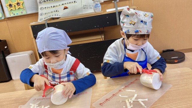 あおぐみさんたちで、野菜をスライサーで切ってもらい、あか・ももぐみさんでジップロックに塩を入れてもみもみ!