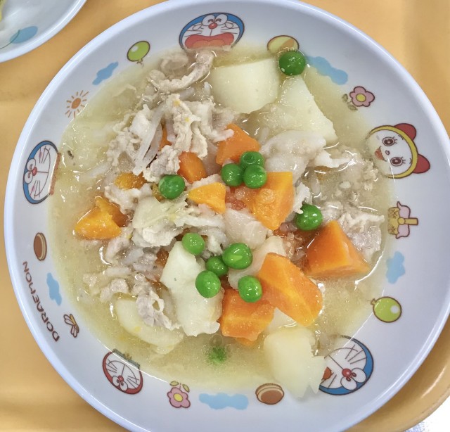 ①野菜は全て角切りにし、グリーンピース、糸こんにゃくは湯通ししておく。