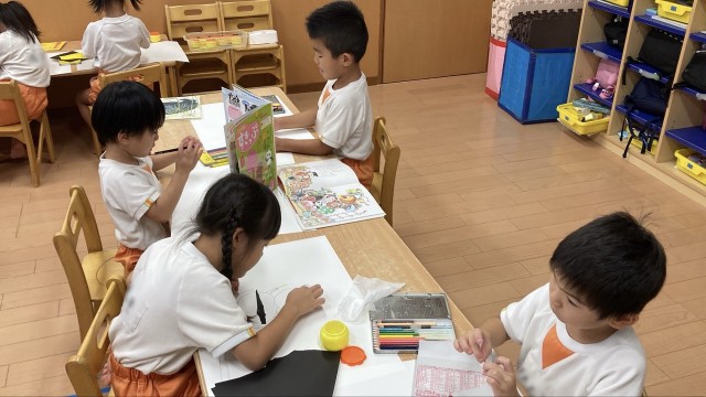 9月10日から9月12日にかけて学年ごとにテーマを決めて、年少、年中、年長にかけて、絵画展をしました。