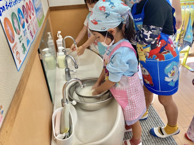 お米研ぎを体験して、「白色の水だー」「綺麗になった」と白く濁っていた水が透明になっていくことを実感していました!
